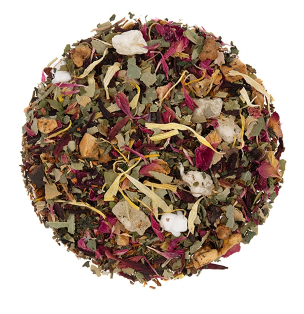 INGREDIENTS: Apple, Hibiscus, Pineapple, Strawberry leaves, Nettle, Rooibos, Beetroot, Rose petals, Aloe, Popped rice, Calendula + Cornflower petals, Natural flavors.