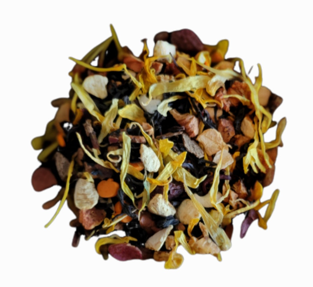 INGREDIENTS: Black tea, Rooibos, Candy*, Apple, Orange, Rosehip, Hibiscus, Calendula + Marigold petals, Cinnamon, Natural flavors (*Candy:Sugar, Corn starch,Vegetable oil,Rice Flour, Soy Lecithin, Dextrin, Confectioner glaze, Arabic+Cellulose gum,Carnauba wax,Blue1, Carrageenan,Yellow5+6, Red40+3 dye) **Allergen Alert - Contains Soy**